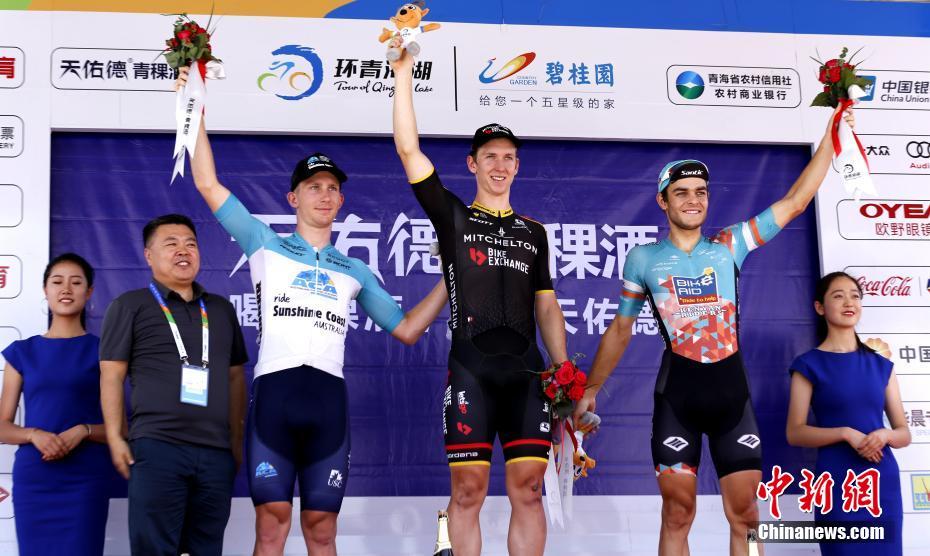 8月4日,“碧桂园杯”2018环青海湖国际公路自行车赛迎来了最后一个赛段兰州新区绕圈赛的比赛。本赛段全长108公里,比赛单圈15.43公里,共绕行7圈,途中共设3个冲刺点。选手竞争异常激烈。最终,用时2小时08分17秒,米奇顿单车交易车队173号格林夫·卡登抢先撞线,获得赛段冠军。备受关注的绿衫,最终由斯洛文尼亚艾德里亚莫贝尔队104号若杰维奇·大山以冲刺总积分110分的领先优势拿下。图为该赛段前三名上台领奖并合影留念。 中新社记者 马铭言 摄