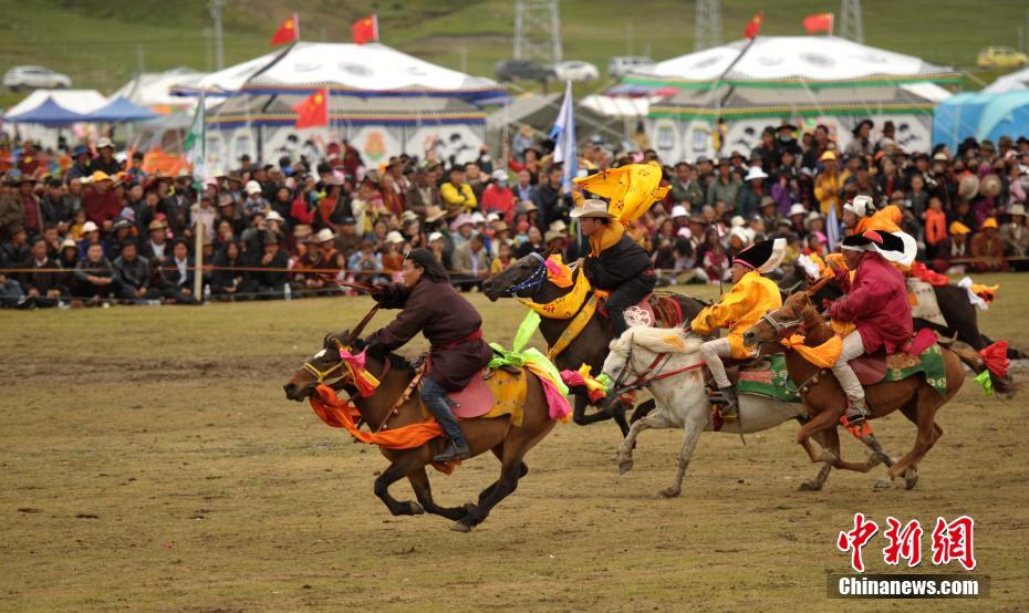 8月4日,四川理塘“八一”赛马场上演一场精彩的马术竞技比赛,引来上万民众和游客观赛。 中新社记者 刘忠俊 摄