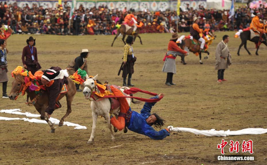 8月4日,四川理塘“八一”赛马场上演一场精彩的马术竞技比赛,引来上万民众和游客观赛。图为参赛的牧民骑手进行捡拾哈达竞技。 中新社记者 刘忠俊 摄