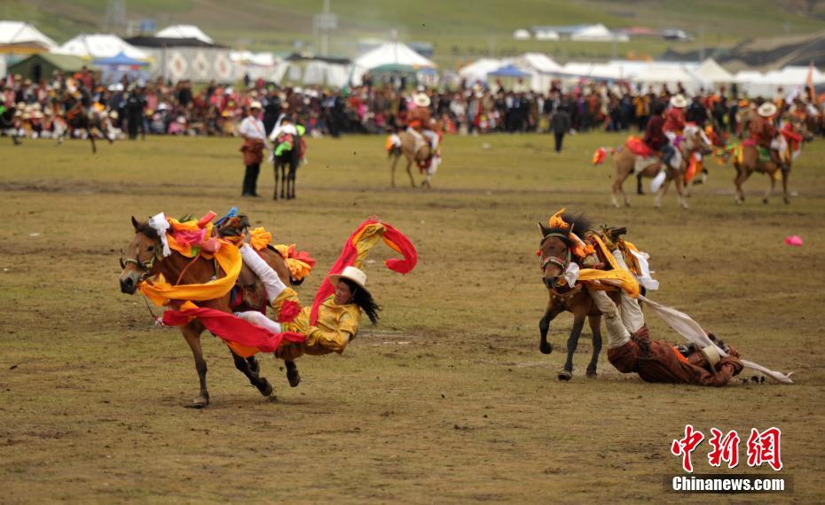 8月4日,四川理塘“八一”赛马场上演一场精彩的马术竞技比赛,引来上万民众和游客观赛。图为牧民骑手进行五彩凌空竞技。 中新社记者 刘忠俊 摄