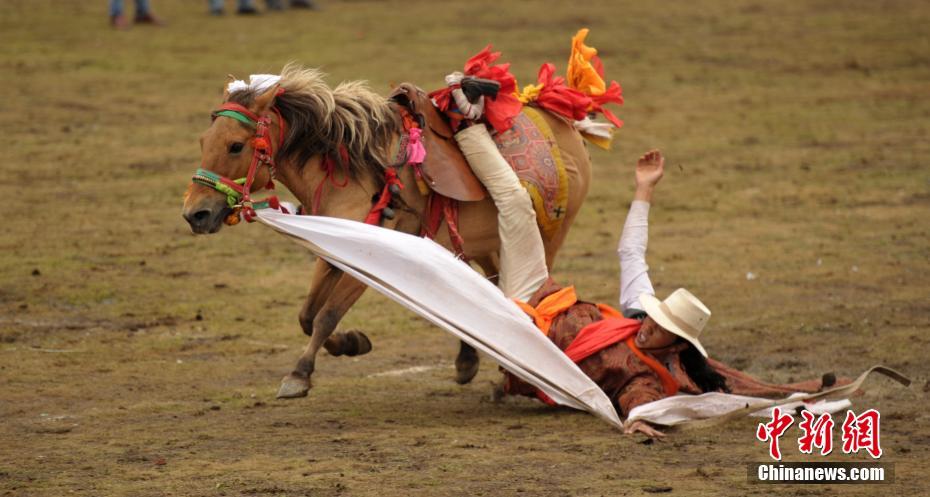8月4日,四川理塘“八一”赛马场上演一场精彩的马术竞技比赛,引来上万民众和游客观赛。图为牧民骑手进行镫里藏身竞技。 中新社记者 刘忠俊 摄