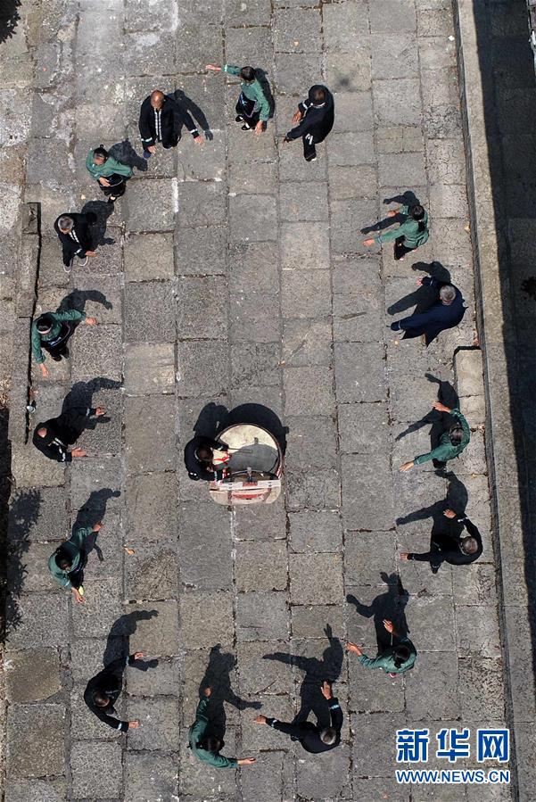 8月4日,湖北省恩施土家族苗族自治州来凤县百福司镇舍米湖村的土家族群众围着大鼓跳摆手舞(无人机拍摄)。 摆手舞发源于鄂、湘、渝、黔交界的酉水流域,集舞蹈艺术与体育健身于一体,有“东方迪斯科”的美誉,2006年被列入第一批国家级非遗名录。 新华社发(杨顺丕 摄)