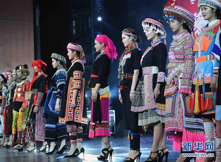 8月4日,模特在赛装文化节颁奖文艺晚会上展示获奖民族服饰。新华社记者杨宗友摄