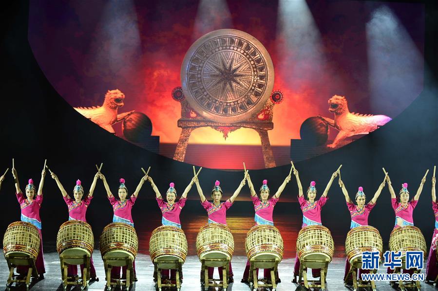 8月4日,女子鼓舞队在赛装文化节颁奖文艺晚会上表演《鼓舞飞花》。新华社发(谢子艺 摄)