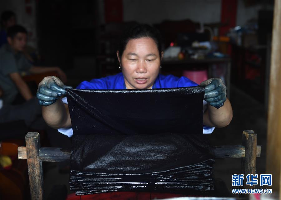 8月4日,在广西柳州市三江侗族自治县林溪镇林溪村皇朝屯,侗家妇女从染缸中取出染好的侗布。 盛夏时节,在三江侗族自治县的侗寨里,侗家人迎来染制侗布的“黄金季”。 侗布,在侗乡大山里又叫“亮布”,使用古朴简单的印染工具和天然原料经“十染十漂十捶”,最后熏蒸后晒干而成。用这种古老技艺印染出来的布料在阳光下闪闪发光,呈金属光泽,且保暖、防水、透气、抗菌,备受侗族人民喜爱。 新华社发(黎寒池 摄)