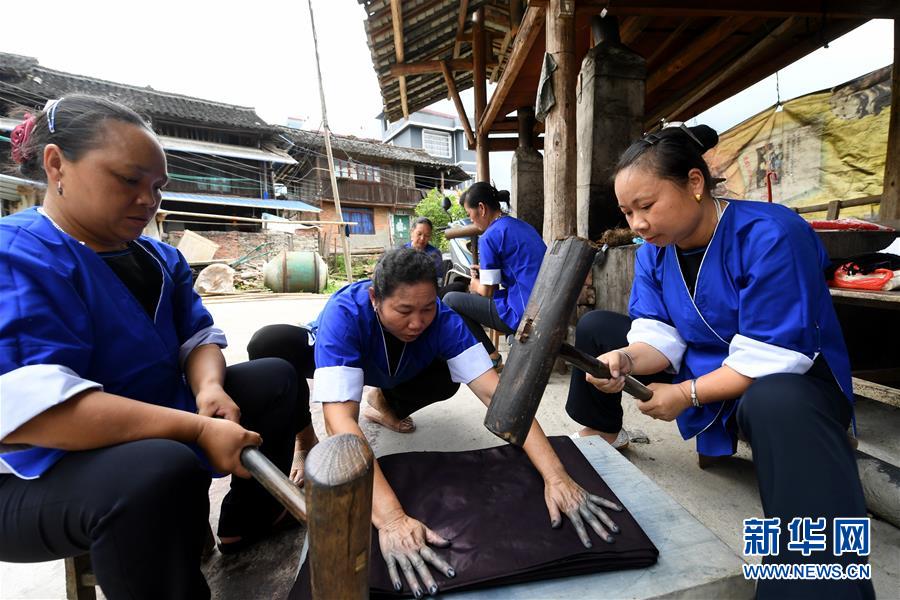 8月4日,在广西柳州市三江侗族自治县林溪镇林溪村皇朝屯,侗家妇女在石板上捶打侗布。 盛夏时节,在三江侗族自治县的侗寨里,侗家人迎来染制侗布的“黄金季”。 侗布,在侗乡大山里又叫“亮布”,使用古朴简单的印染工具和天然原料经“十染十漂十捶”,最后熏蒸后晒干而成。用这种古老技艺印染出来的布料在阳光下闪闪发光,呈金属光泽,且保暖、防水、透气、抗菌,备受侗族人民喜爱。 新华社发(黎寒池 摄)