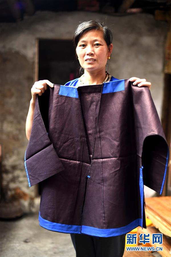 8月4日,在广西柳州市三江侗族自治县林溪镇林溪村皇朝屯,侗家妇女石勇花展示用侗布制作成的衣服。 盛夏时节,在三江侗族自治县的侗寨里,侗家人迎来染制侗布的“黄金季”。 侗布,在侗乡大山里又叫“亮布”,使用古朴简单的印染工具和天然原料经“十染十漂十捶”,最后熏蒸后晒干而成。用这种古老技艺印染出来的布料在阳光下闪闪发光,呈金属光泽,且保暖、防水、透气、抗菌,备受侗族人民喜爱。 新华社发(黎寒池 摄)