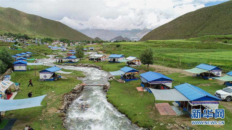 在拉萨市近郊白定村,“过林卡”的群众撑起的帐篷在小溪旁排开(8月4日无人机拍摄)。 新华社记者 刘东君 摄