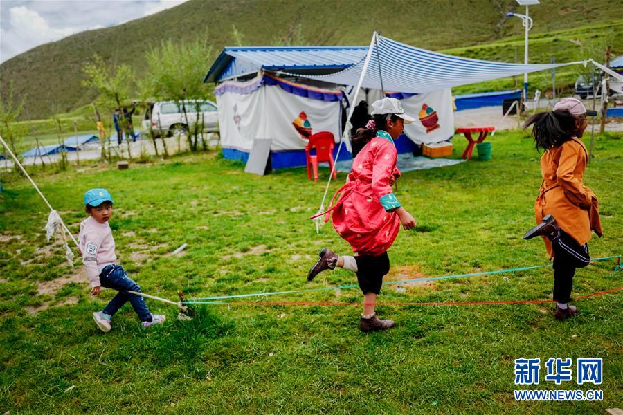 几名儿童在拉萨市近郊白定村的草地上嬉戏(8月4日摄)。 新华社记者 普布扎西 摄
