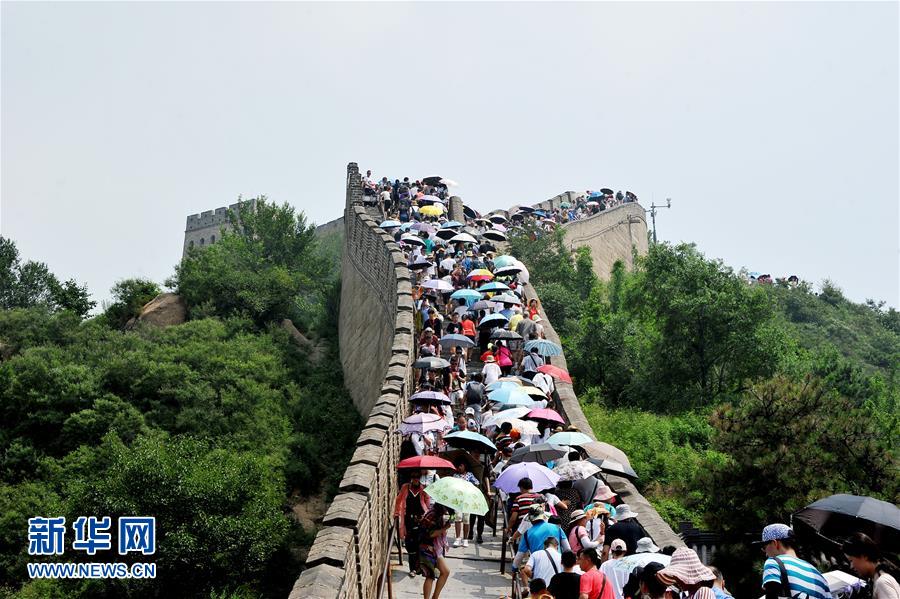 8月5日,游客攀登位于北京市延庆区的八达岭长城。进入暑期后,北京八达岭长城迎来旅游高峰期。虽然天气炎热,仍有大批游客接踵而来。 新华社发(陈晓东 摄)