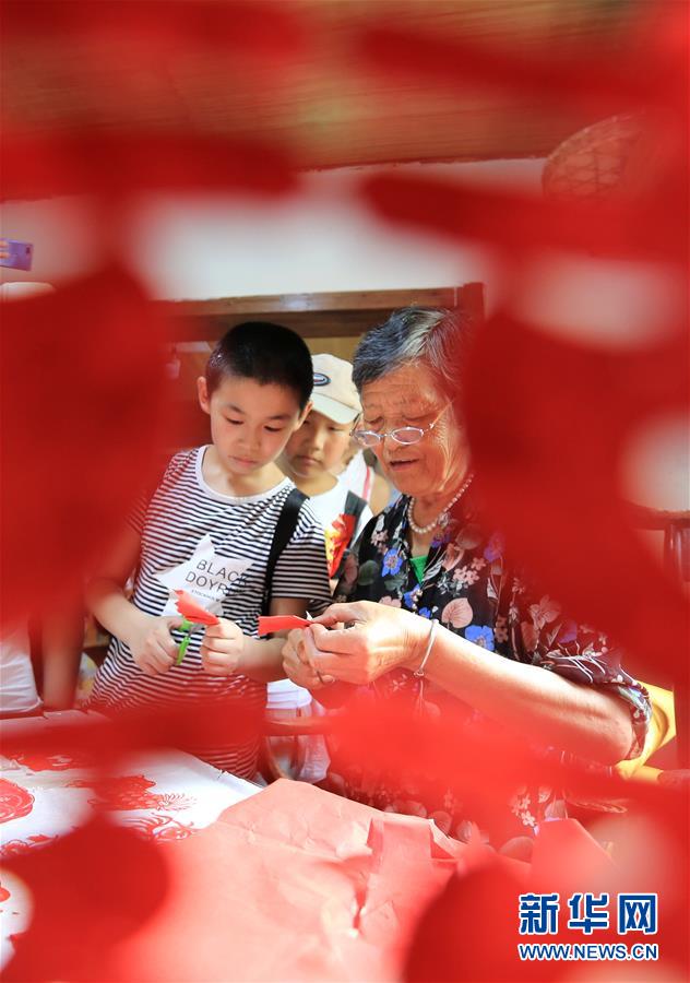 8月5日,在山东省临沂市沂南县竹泉村,研学旅行的孩子们跟随剪纸艺人学习剪纸技法。