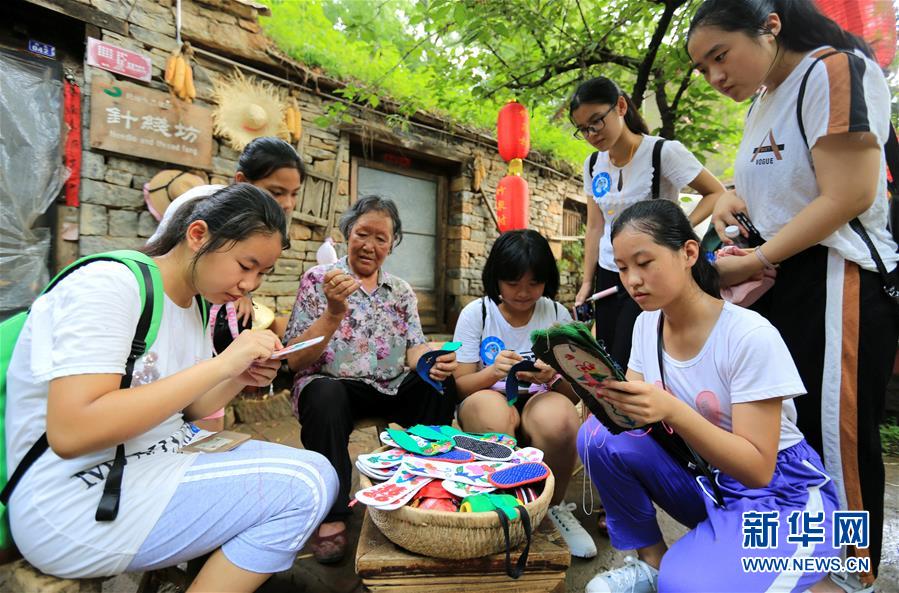 8月5日,在山东省临沂市沂南县竹泉村研学旅行的孩子们在村民的指导下体验纳鞋垫。
