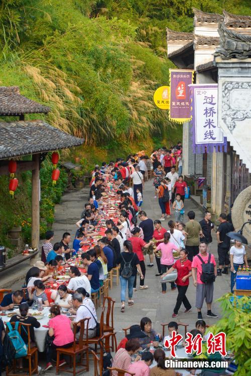 8月4日傍晚,中国江南地区高温酷暑依旧,在江西婺源篁岭古村近千名通过报名招募的游客,共享当地长街宴,品尝自产的农家土菜。华灯初上,五彩灯光里的古村,一个个圆形晒匾掩映在粉墙黛瓦之间,与闪亮的夜灯一起勾勒出古村美丽的轮廓。篁岭古村天街成了郭沫若诗里“天上的街市”。 方华彬 摄