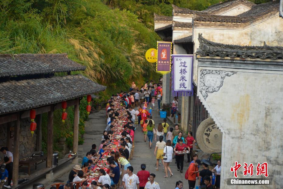 8月4日傍晚,中国江南地区高温酷暑依旧,在江西婺源篁岭古村近千名通过报名招募的游客,共享当地长街宴,品尝自产的农家土菜。华灯初上,五彩灯光里的古村,一个个圆形晒匾掩映在粉墙黛瓦之间,与闪亮的夜灯一起勾勒出古村美丽的轮廓。篁岭古村天街成了郭沫若诗里“天上的街市”。 方华彬 摄
