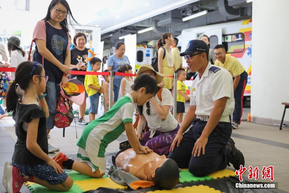 8月5日,香港消防及救护学院举行开放日,庆祝香港消防处成立150周年,同时也让市民更了解消防处的工作和人员的培训。图为救护员指导香港小朋友进行急救训练。 中新社记者 谢光磊 摄