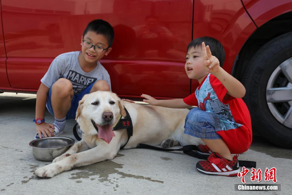 8月5日,香港消防及救护学院举行开放日,庆祝香港消防处成立150周年,同时也让市民更了解消防处的工作和人员的培训。图为香港小朋友与搜救犬亲密互动。 中新社记者 谢光磊 摄