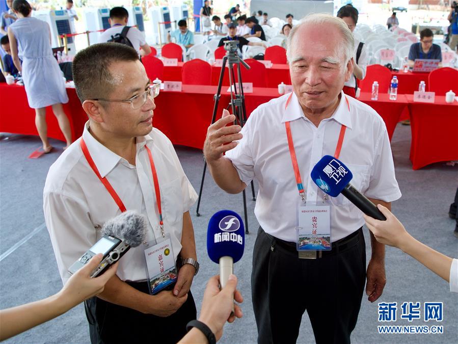 8月5日,在福建晋江举行的福建向金门供水工程通水现场会上,来自金门的王再生老人(右)和福建省水投集团公司副总经理朱金良(左)接受采访。 当日上午,福建向金门供水工程通水现场会在福建晋江举行。与此同时,金门当地也举行通水见证仪式。