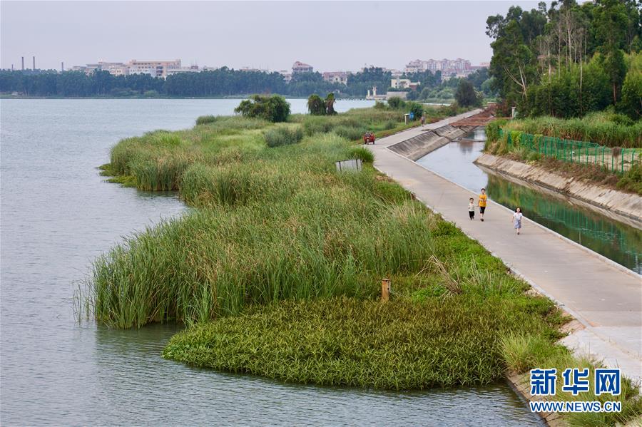 8月4日,几位小朋友走在福建向金门供水工程取水地晋江龙湖湖畔。