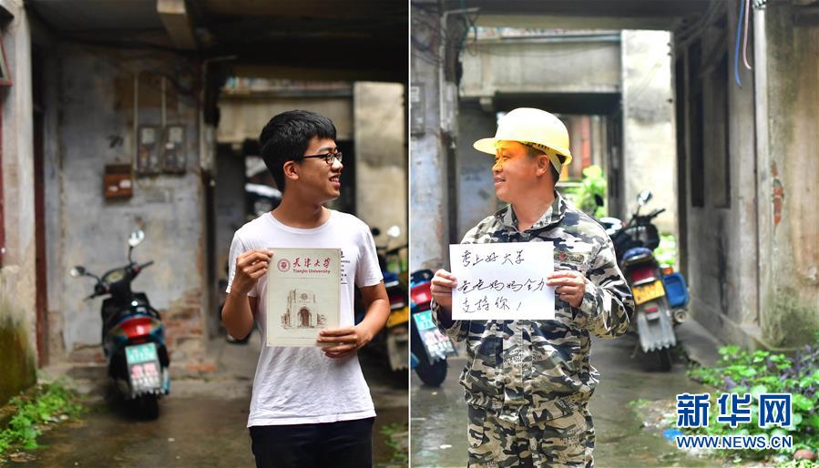 拼版照片:左图为广西融水苗族自治县考生贾云锋手捧刚刚收到的天津大学录取通知书(7月31日摄);右图为贾云锋的父亲贾庆宏在考前手捧写有对儿子期待的纸片(5月29日摄)。44岁的贾庆宏在县城打工,是一名建筑工。贾云锋说,因为家庭贫困,学费只能依靠助学贷款,到学校后尽量参加勤工俭学以减轻父母的负担。 广西融水苗族自治县是国家扶贫工作重点县,全县“九山半水半分田”,山区交通不便,生存环境较为恶劣,脱贫攻坚任务艰巨,目前还有7.68万贫困人口。大苗山淳朴的人们,始终坚信知识改变命运,很多农村家庭求学追梦的孩子,实现了最初的梦想。 2018年,融水中学一共有341名贫困生参加高考,其中考上一、二本267人,专科以上上线率百分之百。 9月,他们即将带着父母的嘱托、山乡的期望,走进梦想的大学校门,开启新的人生…… 近年来,融水苗族自治县积极落实国家系列教育扶贫惠民政策,采取免、减、奖、贷、助、补等多种方式,加大对贫困学生的资助力度。2017年,融水有3360名贫困大学生申请助学贷款,贷款金额2306万元。 新华社记者 黄孝邦摄