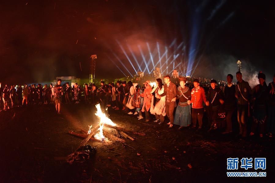 8月5日,四川昭觉县的彝族同胞与游客围着燃烧的篝火跳起欢快的达体舞。8月5日,全国多地的彝族同胞举行多彩的民族特色活动,欢庆火把节。新华社发(吕明泽 摄)