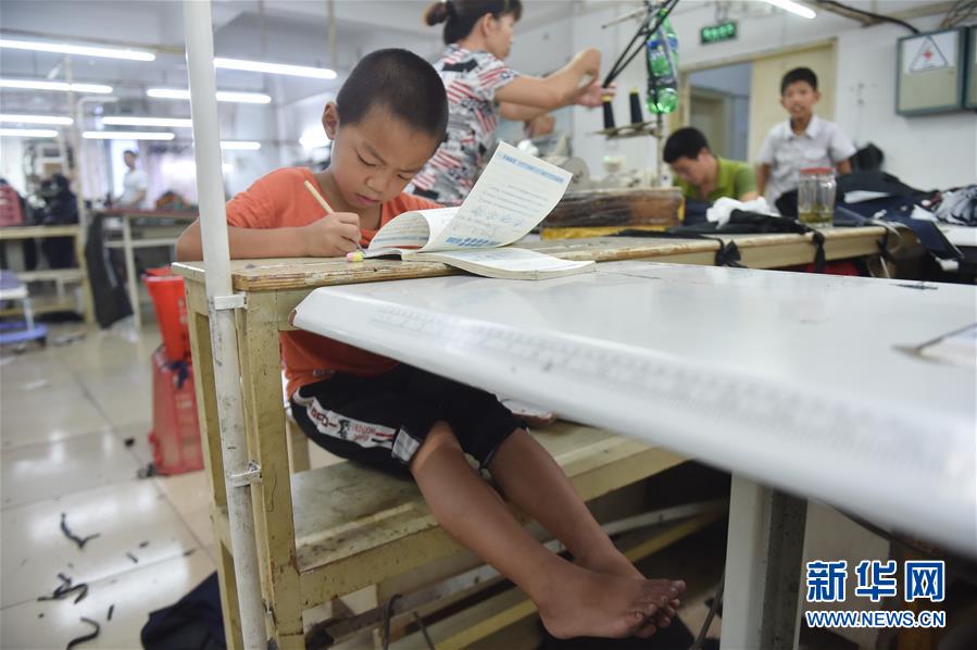在福建省石狮市金利莱斯服装厂,今年秋季即将上三年级的欧春鸿在做暑假作业,他的父母正在身后忙碌(7月31日摄)。新华社记者 宋为伟 摄