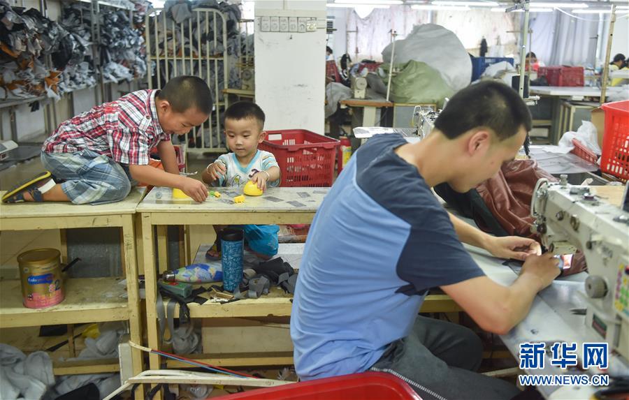 在福建省石狮市金利莱斯服装厂,聪聪(中)在父亲的工位旁和小伙伴欧一鸿玩玩具(7月31日摄)。新华社记者 宋为伟 摄