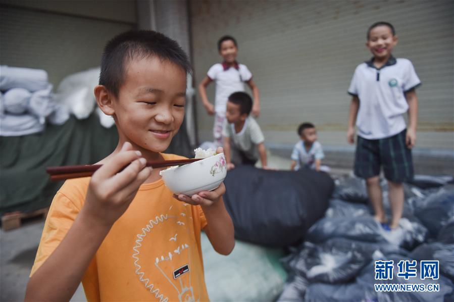 在福建省石狮市金利莱斯服装厂,刘宇翔在车间外吃晚饭(7月31日摄)。新华社记者 宋为伟 摄