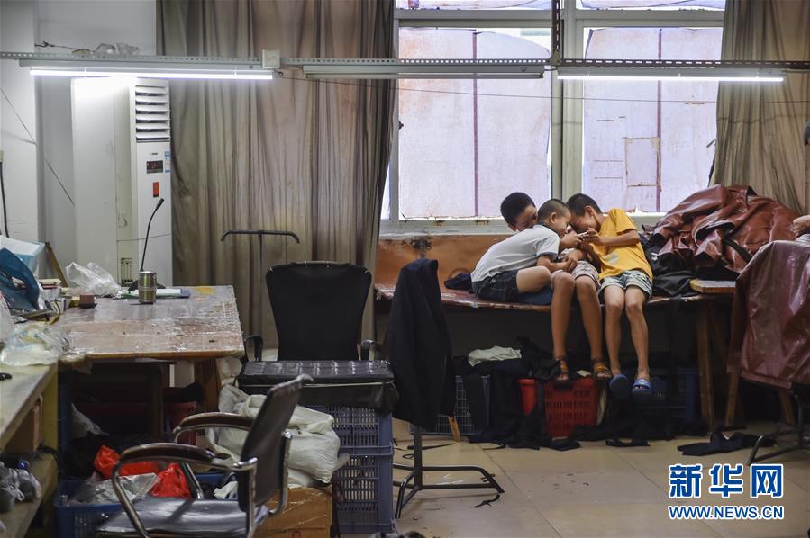 在福建省石狮市金利莱斯服装厂,刘宇翔(右)和小伙伴坐在桌子上玩手机(7月31日摄)。新华社记者 宋为伟 摄