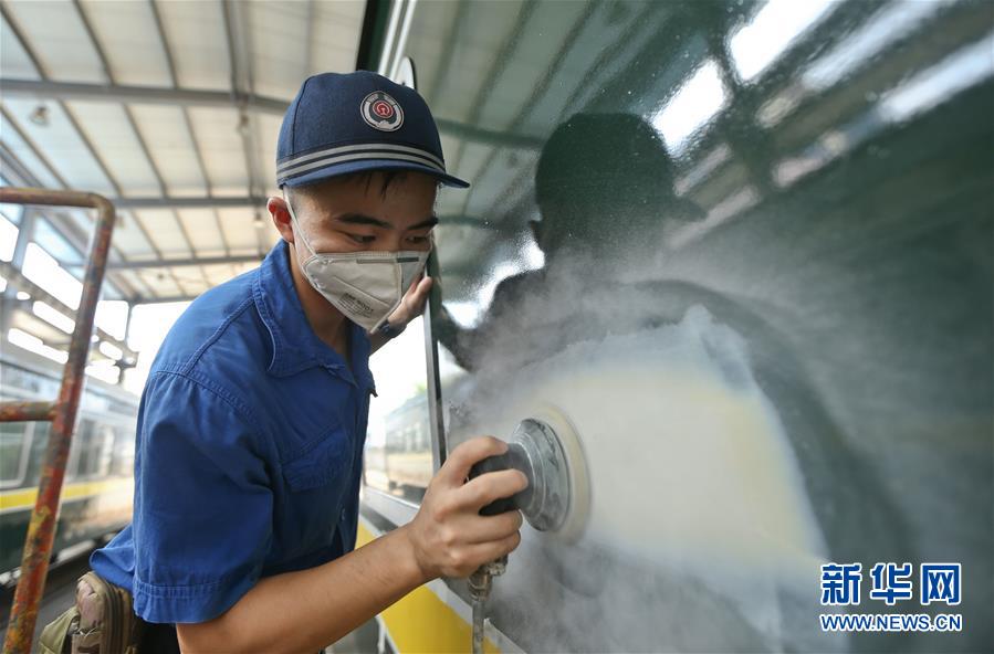 8月6日,南昌车辆段的油漆工对列车进行“美容”。 新华社发(张学东 摄)