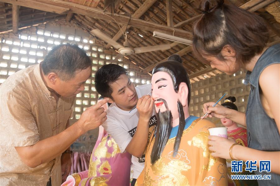 8月6日,许明笙(中)和妻子朱悦(右)在进行泥塑创作,父亲许良国在一旁指导。 新华社记者翁忻旸摄