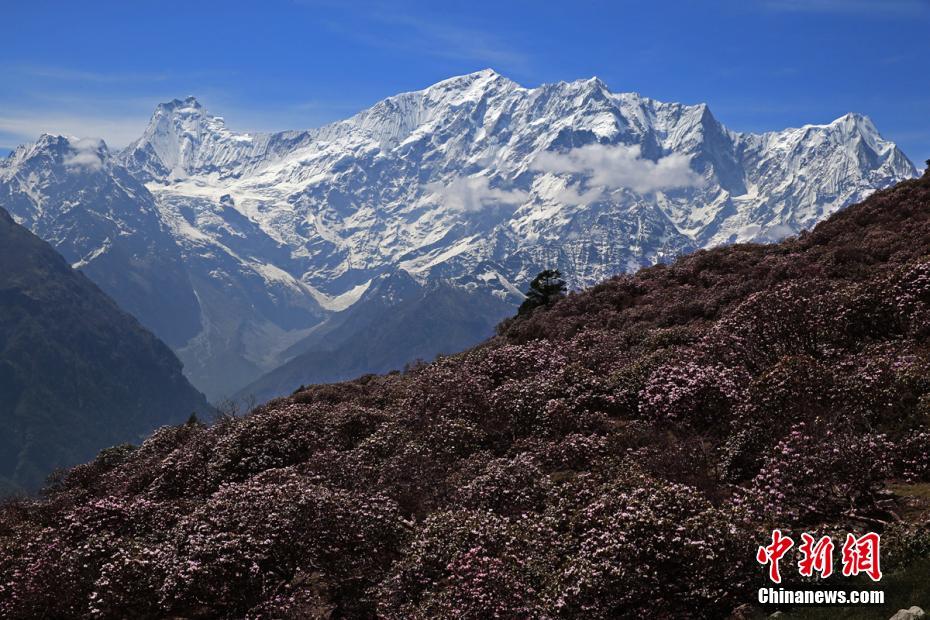 吉隆沟给人最大的感受是惊讶于造物的神奇,让四季并存在这狭小的山谷间。峡谷绿树成荫,恬静的村庄被绿树环抱着,不远处能清楚地看见若隐若现的雪山。图为杜鹃花与尼泊尔朗塘雪山交相辉映。 杨建 摄
