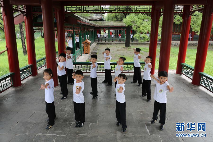 8月8日,孩子们在位于河北省承德市的避暑山庄内练习太极。 当日是全民健身日,各地举行丰富多彩的健身活动,倡导文明健康的生活方式。 新华社发(刘环宇 摄)