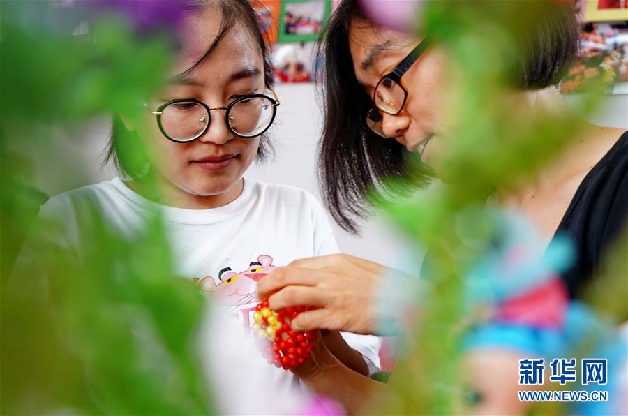 8月7日,王丹(左)在唐山市路南区残疾人就业培训中心指导一位学员编织串珠工艺品。