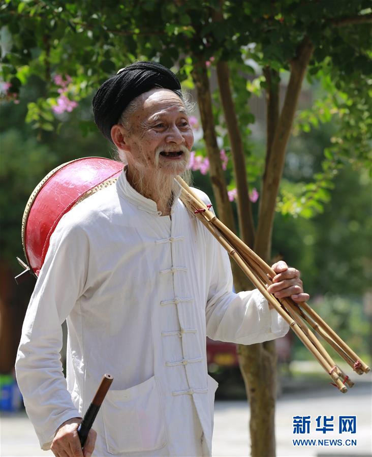 8月7日,在张家界市武陵源区溪布老街,金德安为表演“打溜子”做准备。 在湖南省张家界市武陵源区非遗展示基地溪布老街,八旬民间艺人金德安和他的团队经常为游客表演“金氏打溜子”。铿锵有力的动作、配合默契的表演、独特的艺术风格和丰富多样的曲牌,让这种传统艺术形式深受各地游客的喜爱。 “打溜子”是当地传统的民间器乐合奏,历史悠久。金德安儿时随父辈学习“打溜子”、吹打乐等民间技艺,之后他通过不断挖掘和整合,将打溜子与吹打乐结合起来,把唢呐、鼓等乐器融入到打溜子的乐奏中,使各类乐器融于一体,表现力提升,增添了喜庆欢乐氛围。这种演奏技巧被当地人称为“金氏打溜子”。 如今,年过八旬的金德安和他的“金氏打溜子”在当地颇有名气。除了在溪布老街表演外,他和他的团队还经常受邀参加各地组织的非遗展演活动,并出访过法国、美国、韩国等多个国家和地区,成为当地旅游推广的一张名片。 新华社发(吴勇兵 摄)