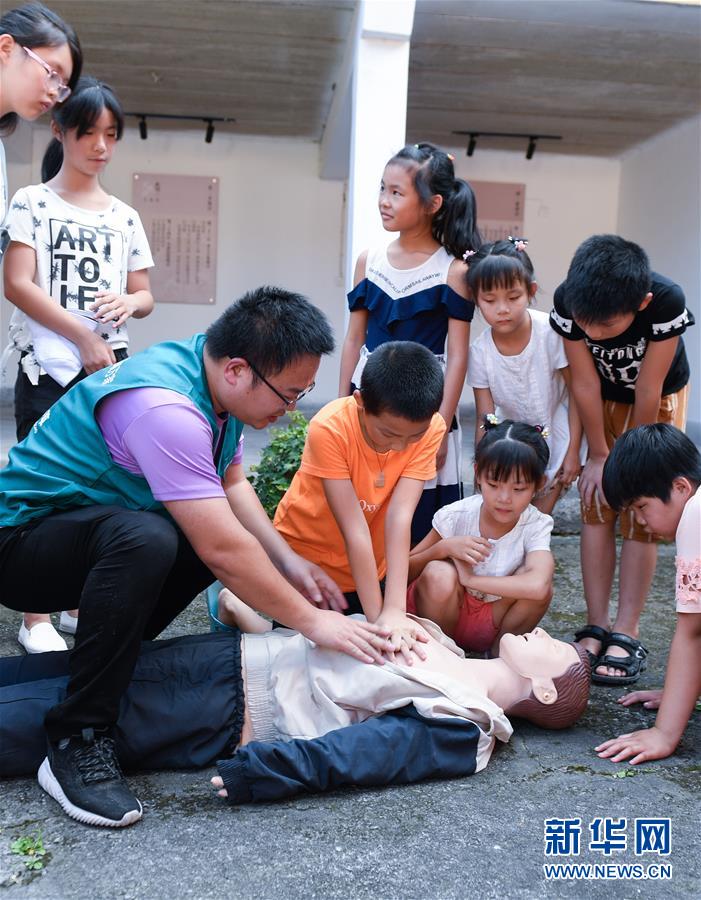 当日,浙江省宁波市奉化区的小草志愿服务队来到大堰镇后畈村,为10余名山村里的小学生带来一堂暑期安全课。志愿者讲解如何应对溺水、触电、着火等突发情况,还为孩子们培训心肺复苏等急救操作技能。