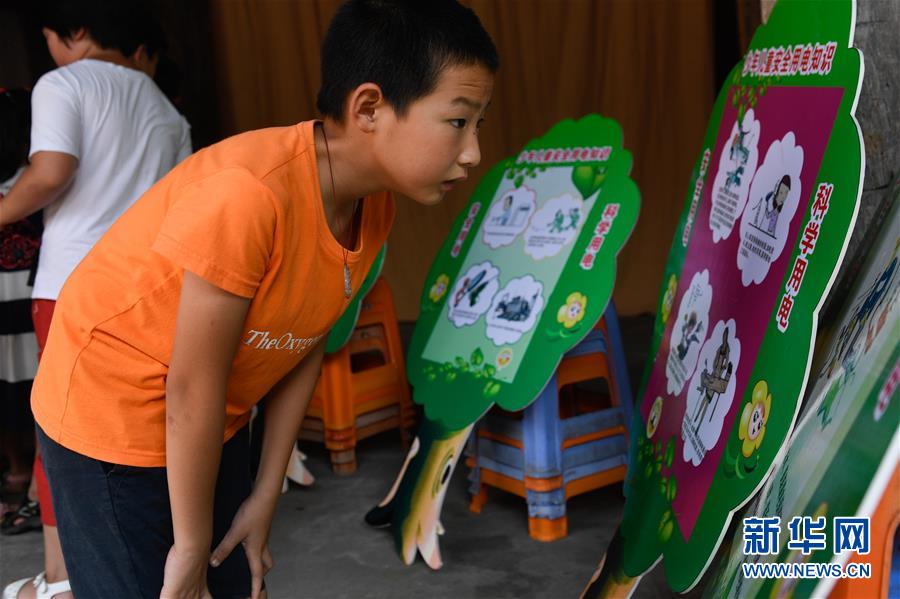8月8日,一名小朋友在观看少年儿童安全用电知识展板。 新华社记者黄宗治摄