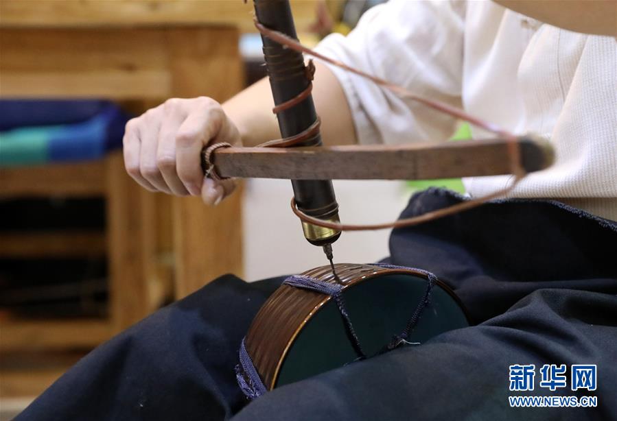 8月6日,河北省非物质文化遗产项目代表性传承人李军航用金刚钻为残破瓷器打孔。 新华社发(梁子栋 摄)