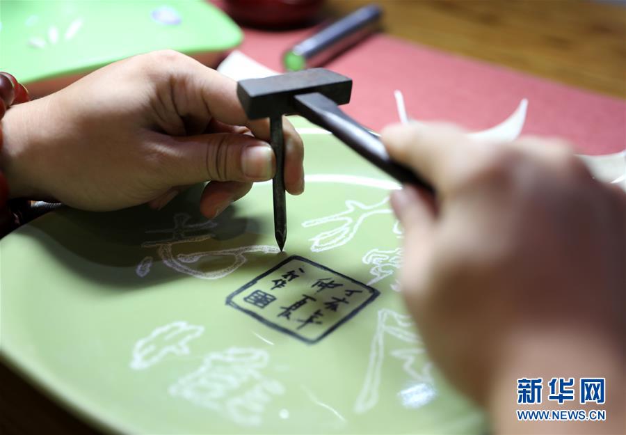 8月6日,河北省非物质文化遗产项目代表性传承人李军航在进行刻瓷。 新华社发(梁子栋 摄)