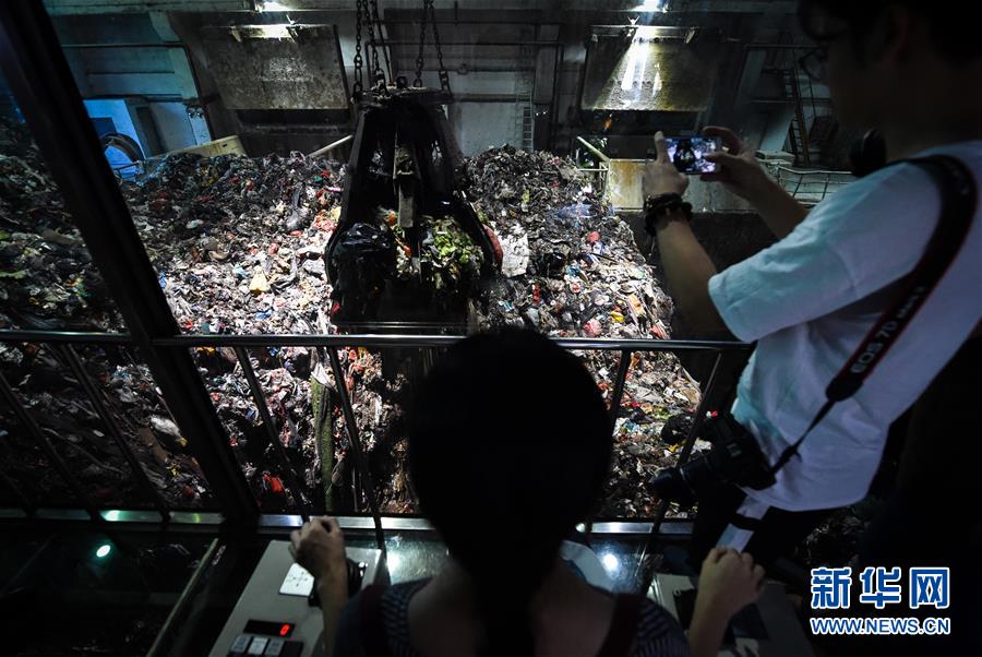 8月8日,在深圳市能源环保有限公司盐田垃圾发电厂,市民代表观看工作人员操作垃圾吊搬运待焚烧的垃圾。 新华社记者毛思倩摄