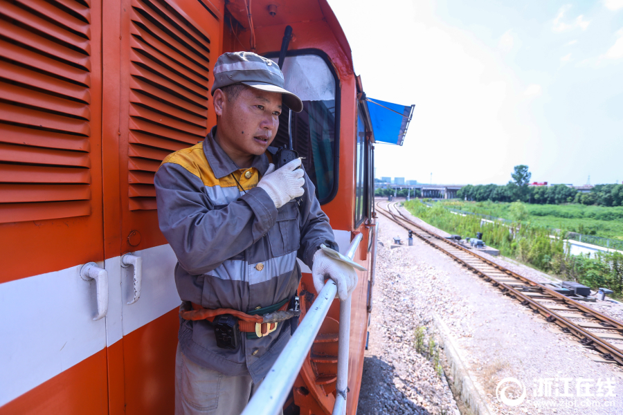 高温炙烤下,铁皮的车厢被晒到接近70℃,为防止烫伤,调车员必须全身裹得严严实实的。上晒下烤,一趟作业下来工装很快就被汗水打湿了。而一天,他们总共要对300多节车厢进行作业。(浙江在线记者 张孙超 阮西内 张帆 拍友 陈侃 摄)