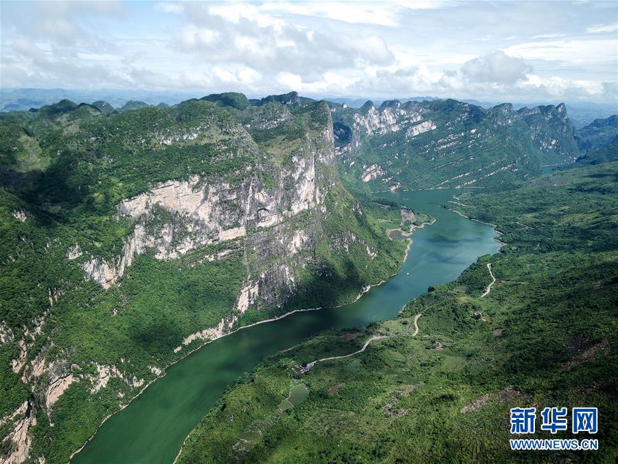 8月7日在贞丰县境内拍摄的北盘江峡谷美景(无人机拍摄)。当日是立秋节气,贵州省黔西南布依族苗族自治州贞丰县天气晴好,境内的北盘江峡谷岩壁与山林交相辉映,风景壮美。新华社记者 陶亮 摄