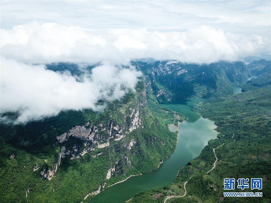8月7日在贞丰县境内拍摄的北盘江峡谷美景(无人机拍摄)。当日是立秋节气,贵州省黔西南布依族苗族自治州贞丰县天气晴好,境内的北盘江峡谷岩壁与山林交相辉映,风景壮美。新华社记者 陶亮 摄
