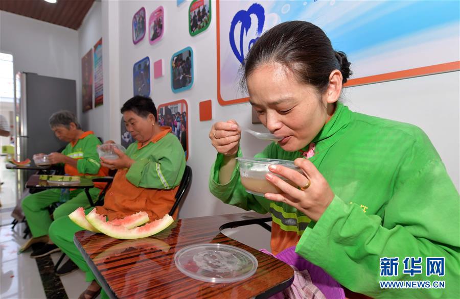 8月9日,在江西省南昌市青云谱区岱山街道爱心驿站,辖区环卫工人在食用绿豆汤等防暑食品。 新华社记者 彭昭之 摄