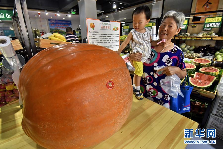 8月9日,在北京双榆树西里车客家园社区连锁店,社区居民在观赏巨型南瓜。 新华社记者 李欣 摄