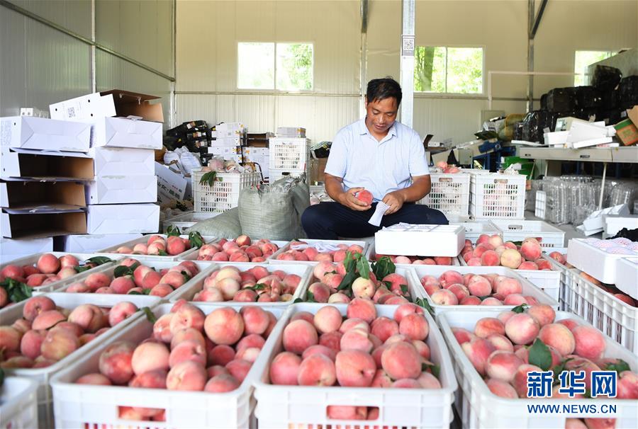 8月9日,申建忠挑拣刚采摘回来的脆桃。 新华社记者王全超摄