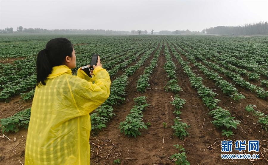 “洮宝”创业团队成员在绿豆种植基地进行手机直播,通过互联网宣传推介产品(7月20日摄)。 新华社记者 许畅 摄