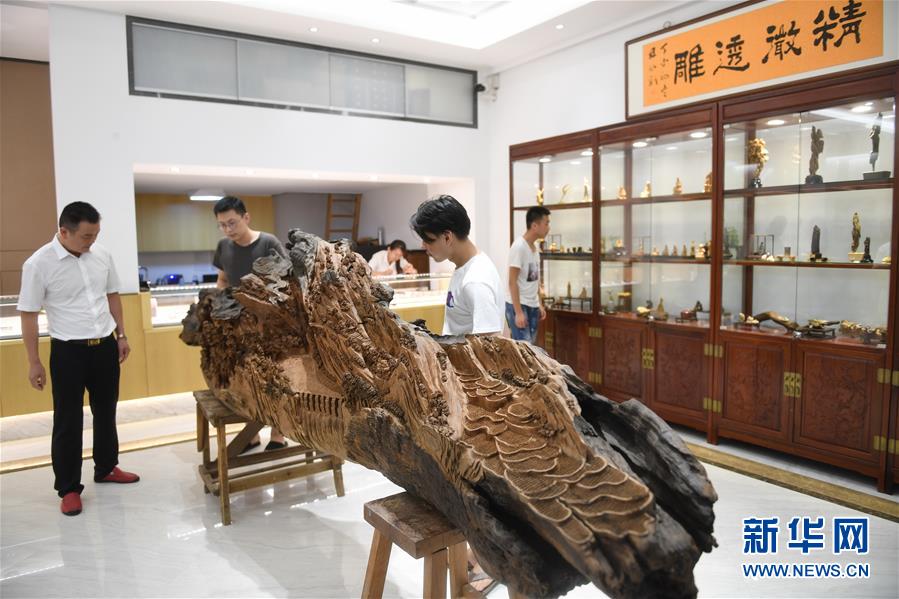 8月9日,市民在莆田工艺美术城的“藏云堂”参观《木兰溪》木雕作品。