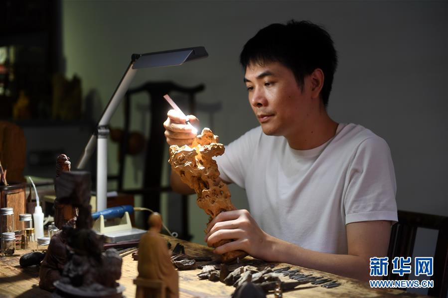 8月9日,国家级非物质文化遗产——莆田木雕的福建省级代表性传承人林建军在位于莆田的工作室里雕刻精微透雕《十八罗汉》。