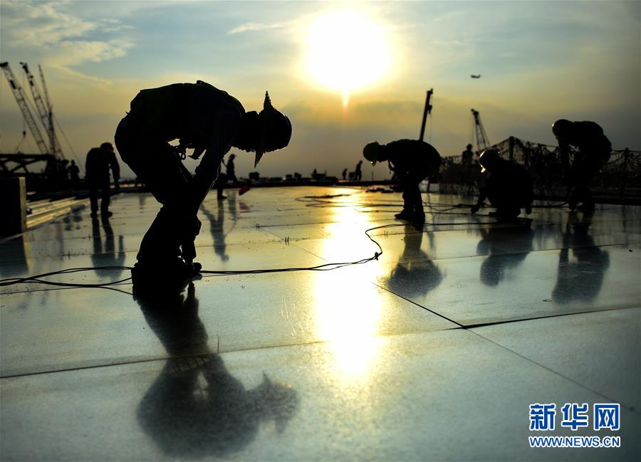 8月9日,工人在深圳国际会展中心项目进行标准展厅屋面施工。 新华社记者 毛思倩 摄