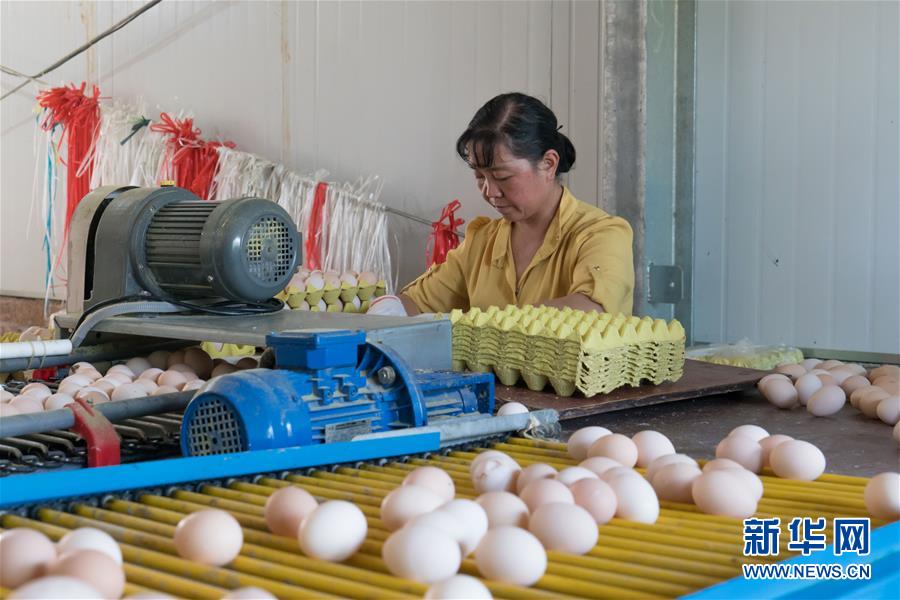8月9日,新田县枧头镇下富村村民在下富村开办的蛋鸡养殖场输送带上分拣鸡蛋。 新华社发(万志云 摄)